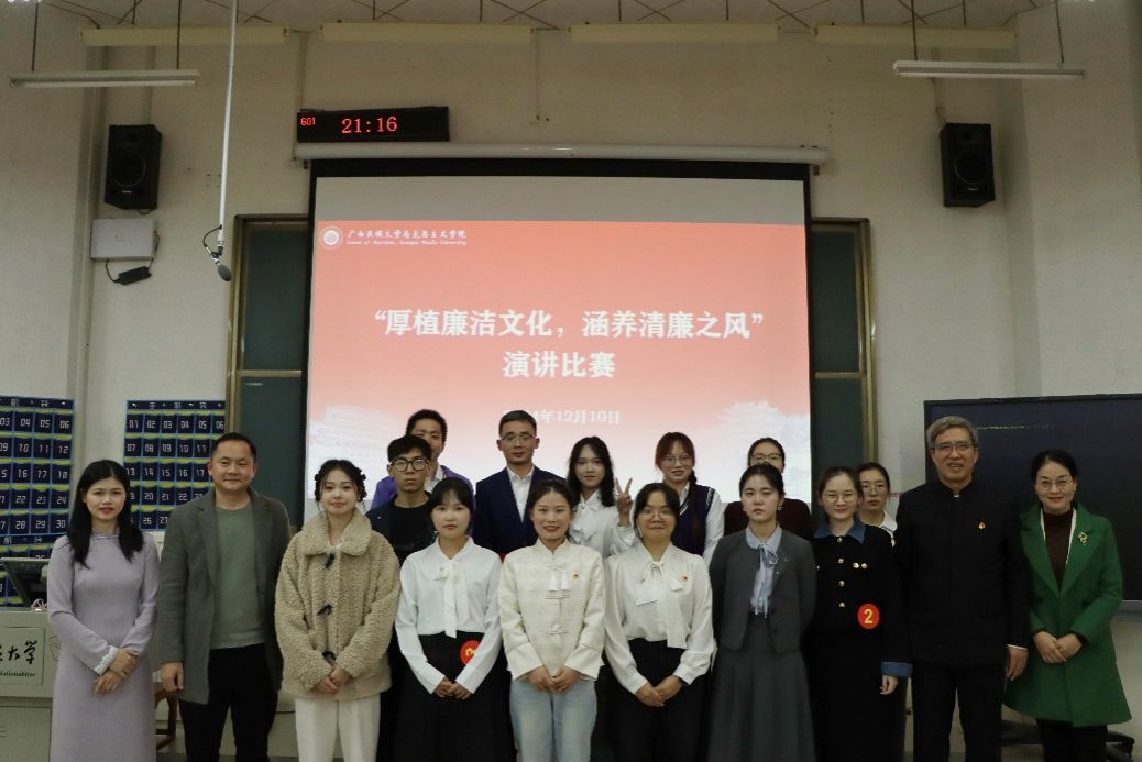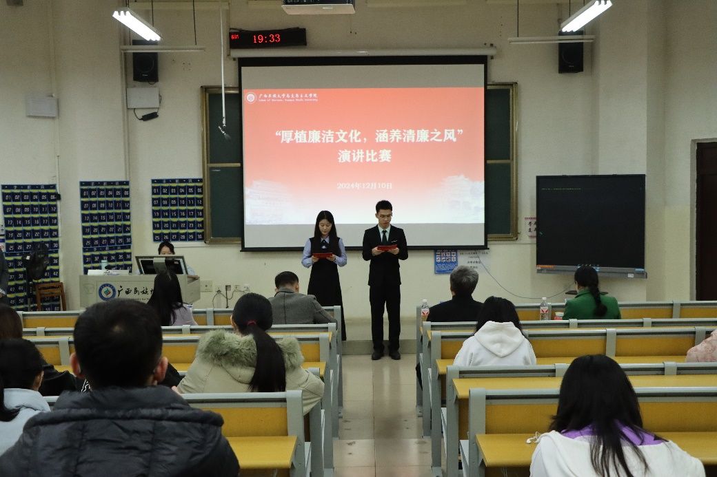 2024年12月10日晚,乐天堂f88第三届“厚植廉洁文化,涵养清廉之风”主题演讲比赛在学友楼601室举办。本次比赛由学校纪委叶华龙,学院教师刘国彬、周园、韦雯担任评委。