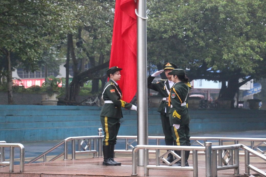 仪式开始,国旗护卫队迈着整齐的步伐护送国旗并进行升旗。随后全体师生一起奏唱国歌,面向国旗行注目礼。