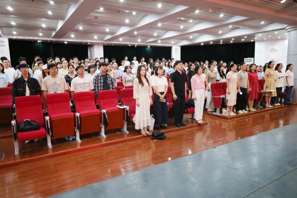 最后,全体人员起立奏唱校歌。在校歌声中,乐天堂f88 2025 级新生开学典礼圆满落幕。