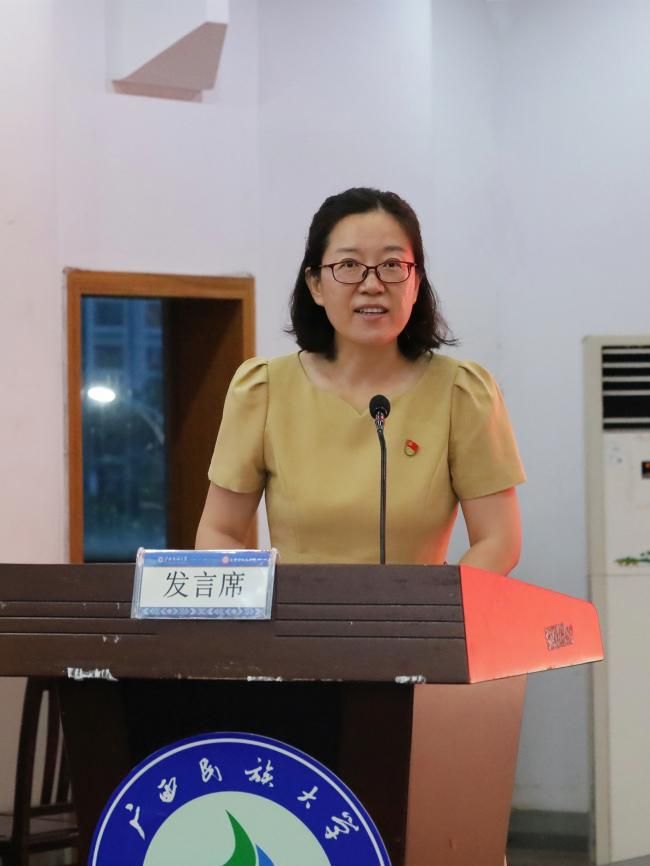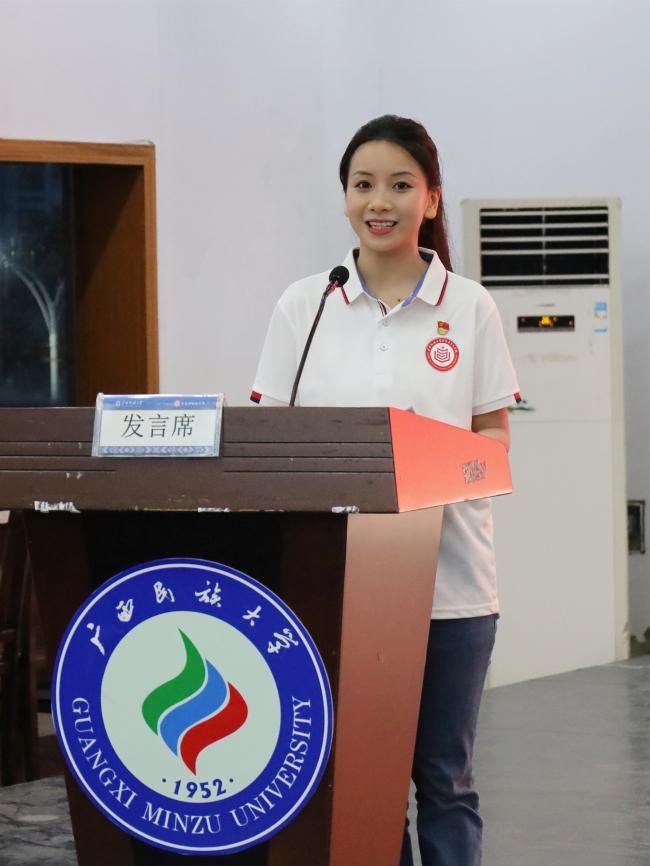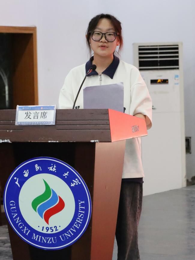 新生代表2025 级中共党史专业本科生温可妍发言,分享了初入广西民族大学的感受,表达了对学院学术氛围与平台的认可。她提到,军训经历让自己对党的优良作风有了更直观的体会,未来将以军训锤炼的毅力投入学习,利用学院资源提升自我,让党的优良传统从“历史记忆” 转化为 “行动自觉”。