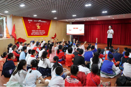 在民族团结进步教育主题宣讲环节,宣讲团成员针对小学生的年龄特点和认知水平,采用图文并茂、知识抢答等生动有趣的方式,深入浅出地讲述了民族特色文化、革命先驱精神以及民族团结的重要性。宣讲团成员用“红石榴”这一形象生动的比喻,描绘了民族团结的美好画面,并讲述了韦拔群等革命先驱不畏艰险、投身革命的感人事迹。宣讲最后,师生们共同唱响歌曲《爱我中华》。