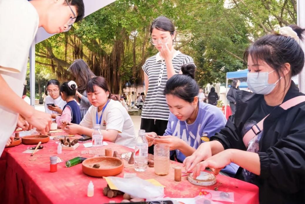 随后,全体成员积极参与民族传统文化育人体验活动。在活动中,支部成员动手体验瓦当拓印、坭兴陶艺、壮族扎染等民族非遗传统工艺,参与背篓绣球、投壶等民族体育项目,让大家在实践中感受民族传统文化的独特魅力,深刻体会其中的深厚底蕴和强大凝聚力。