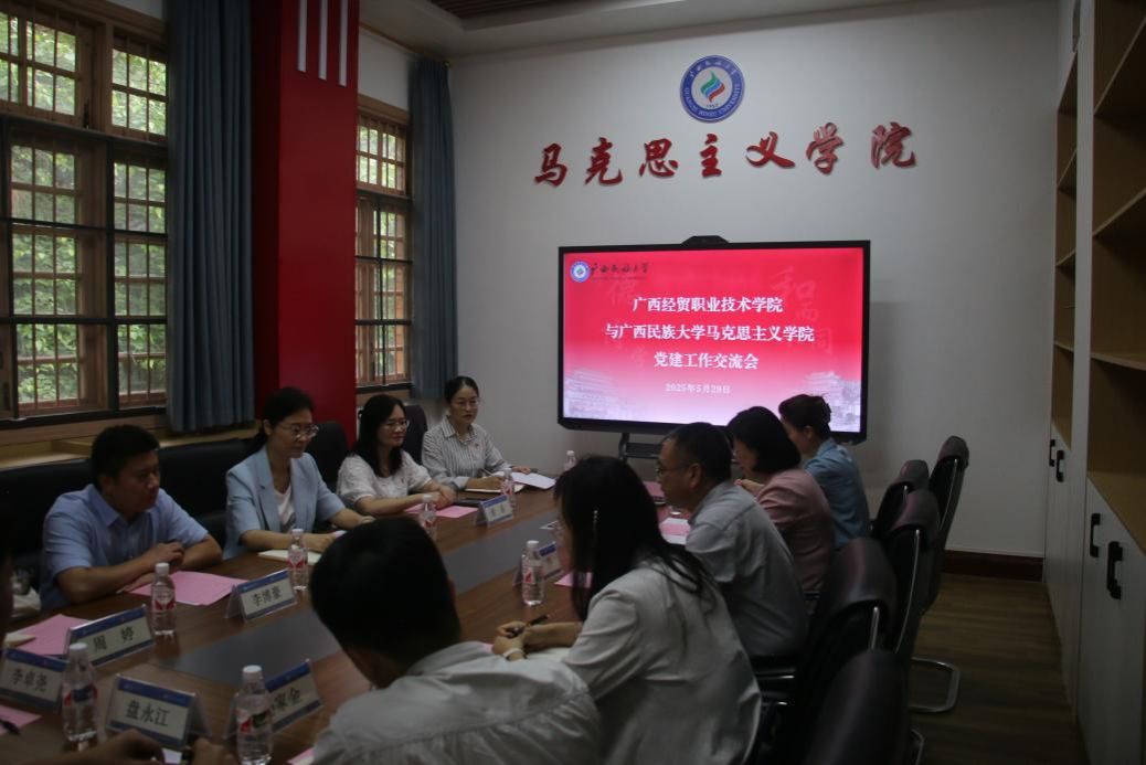 5月25日下午,广西经贸职业技术学院一行到乐天堂f88开展党建交流活动。广西经贸职业技术学院党委组织与统一战线工作部部长王乔、副部长许莹、副部长覃漓漓,乐天堂f88党委书记王颖慧、党委副书记谢蓓、院长助理李博豪出席会议,双方就相关工作进行了深入交流。